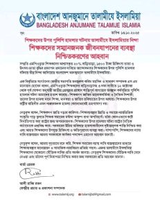নেতৃবৃন্দ বলেন, আমরা দৃঢ়ভাবে মনে করি, শিক্ষক সমাজের ন্যায্য দাবি বাস্তবায়নের মাধ্যমে শিক্ষাব্যবস্থার মানোন্নয়ন ও সামাজিক ন্যায়বিচার প্রতিষ্ঠা সম্ভব। এজন্য তালামীযে ইসলামিয়া শিক্ষকদের যেকোনো যৌক্তিক দাবির প্রতি সমর্থন জানায়। নেতৃবৃন্দ শিক্ষকদের যৌক্তিক দাবি মেনে নেওয়া এবং তাঁদের পূর্ণ নিরাপত্তা নিশ্চিত করার জন্য সরকারের প্রতি আহবান জানান।